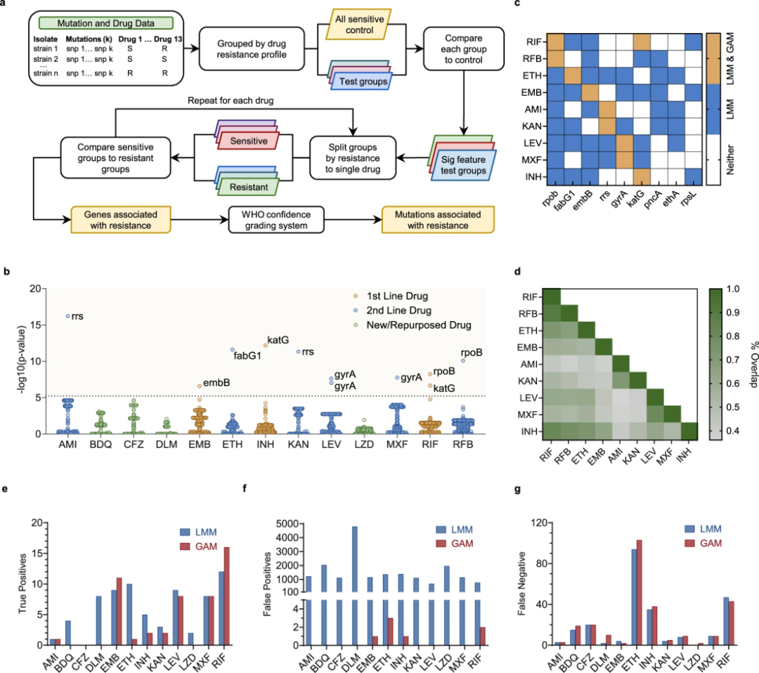 研究团队开发的GAM方法在识别耐药性相关基因变异方面取得了重要突破。如图3所示,这种新方法能够准确找出6个与主要抗结核药物相关的关键基因,且几乎不会出现误判,仅在异烟肼相关基因katG与利福平的关联中出现了一次误报。与传统的基因组关联分析方法(GWAS线性混合模型)相比,GAM的优势非常明显: