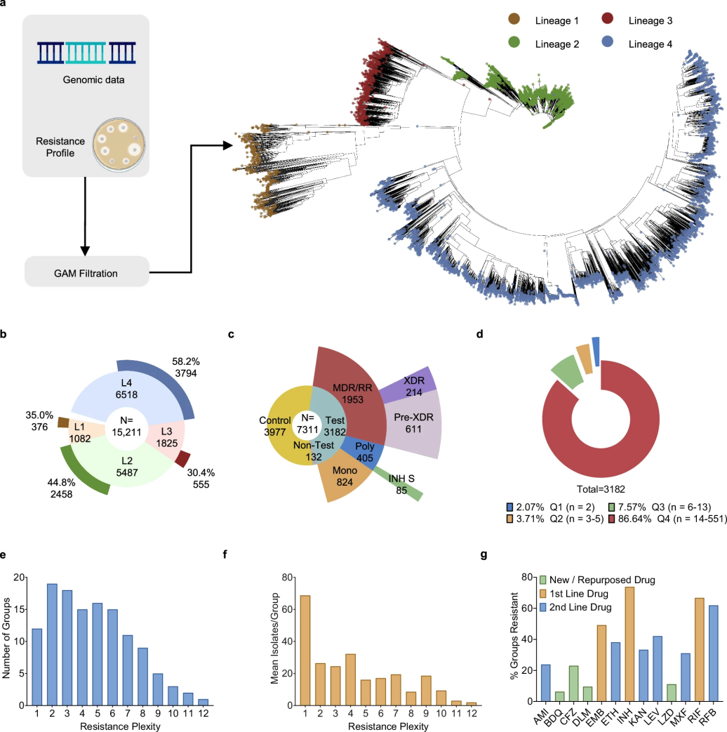 研究团队对超过1.2万个结核分枝杆菌基因组数据进行了全面分析。为确保研究质量,研究人员首先进行了严格的数据筛选,最终保留了约1万个高质量样本(DS1),其中包括7179个完整的耐药性数据样本(DS2)。通过系统发育分析(如图2a, b所示),研究人员发现这些样本在结核分枝杆菌的四个主要家族中分布均匀,这说明研究结果不会因为样本选择偏差而失真。为了更好地研究耐药性特征,研究团队创新性地将样本按照它们对不同药物的耐药模式进行分组,形成了126个研究组(如图2c所示)。