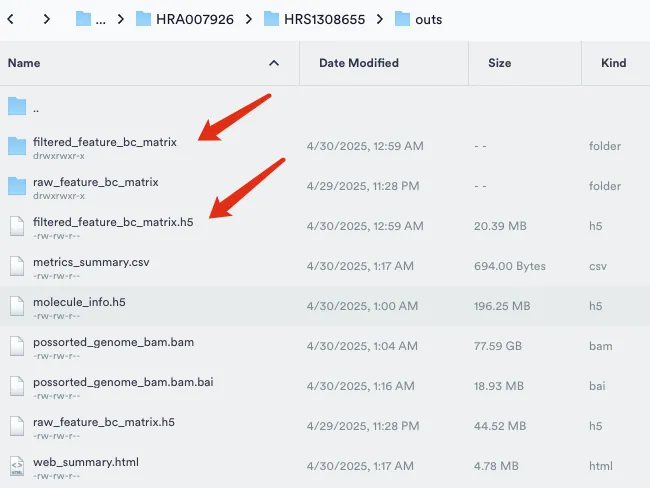 - Raw and Filtered Feature-Barcode Matrices (MEX, H5):raw文件所有检测到的 barcode,包括空滴和低质量细胞。filtered文件经过 Cell Ranger 细胞识别算法筛选出来的“真实”细胞。