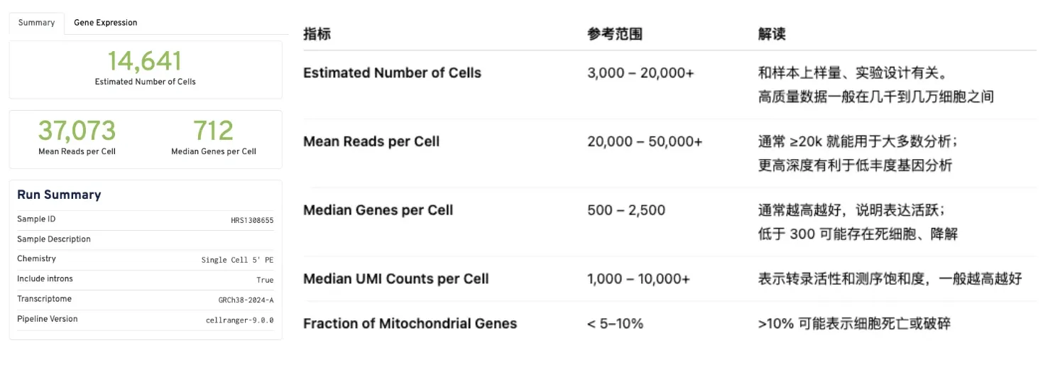 - Cellranger 10X 官方:https://www.10xgenomics.com/support/software/cell-ranger/latest/analysis/outputs/cr-outputs-web-summary-count