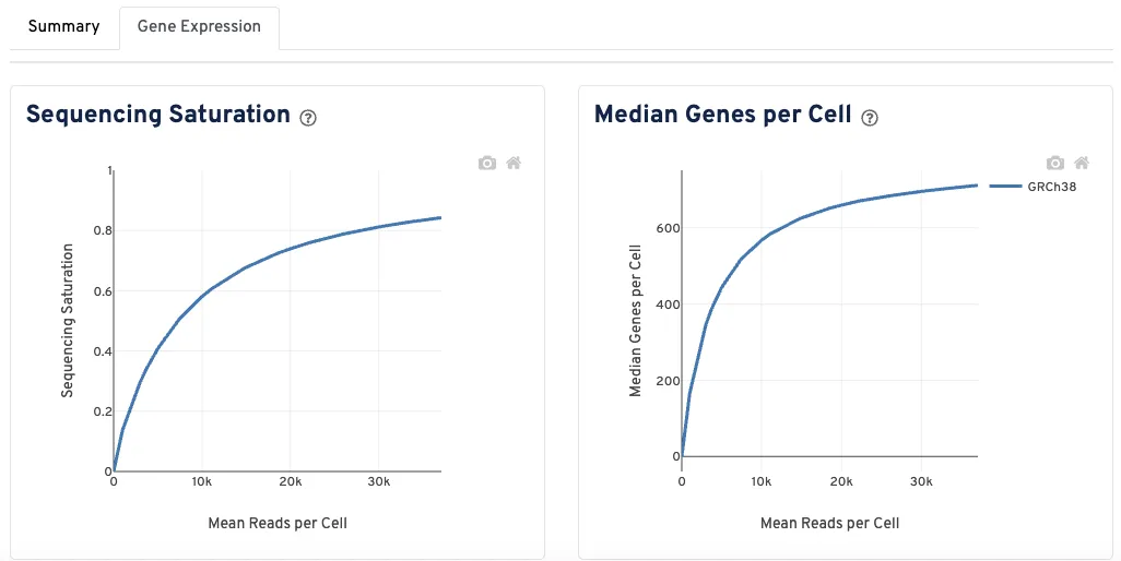 - 左图展示了测序饱和度指标随采样测序深度(以每个细胞平均读数为单位)的变化情况,最大深度为实际观测到的测序深度。测序饱和度是衡量观测到的文库复杂度的指标,当所有转换的mRNA转录本被测序时,该值趋近于1.0(100%)。