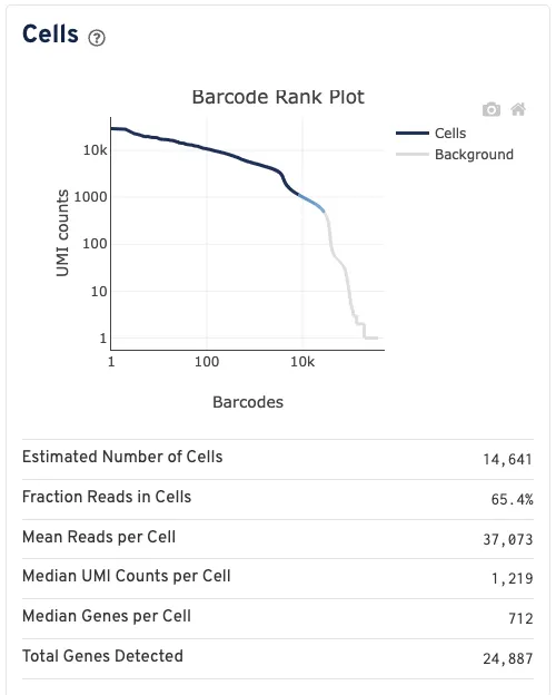 - 条形码排名图 (Barcode Rank Plot): 该图显示映射到每个条形码的过滤后UMI计数。条形码是否被判定为细胞关联不严格基于UMI计数,而可能根据其表达谱确定,或通过蛋白质聚集体检测过滤和/或高占用率Gel Bead-In Emulsion(GEM, 乳滴凝胶珠)过滤移除。因此,图中某些区域可能同时包含细胞关联和背景关联的条形码。这些区域的颜色基于局部细胞关联条形码的密度。将鼠标悬停在图表上会显示该区域中被判定为细胞的条形码总数及占比,以及这些条形码的UMI计数和按UMI计数降序排列的条形码排名。如果这个曲线出现一个明显徒降的趋势,这表明与细胞相关的barcode和空白的barcode区分的很好。