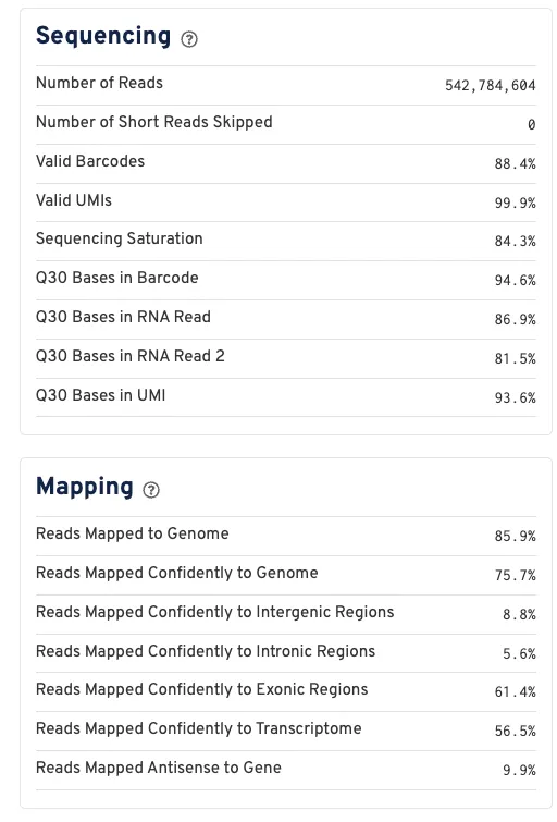 - Web summary(HTML)(count, multi,vdj): 一个交互式网页报告,总结了数据的整体质量,包括了测序质量、reads mapping信息、barcode分布、UMI数量、细胞数估计、基因数等核心指标。