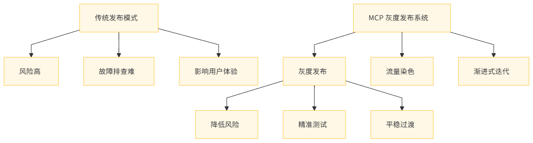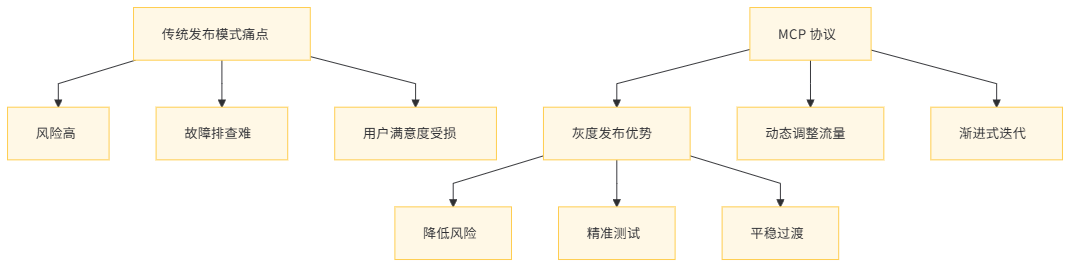二、项目背景 (一)传统发布模式的痛点 全量发布风险高 :在传统的全量发布模式下,一旦新版本软件存在严重问题(如重大漏洞、性能瓶颈等),将会影响所有用户,可能导致系统崩溃、数据丢失等严重后果,给企业带来巨大的损失。例如,某知名电商网站在一次全量发布新功能后,由于代码中存在一个逻辑错误,导致大量用户无法正常下单,最终造成了数百万的经济损失。故障排查困难 :全量发布后,当问题出现时,很难确定是新版本引入的问题还是旧版本就存在的潜在问题,这增加了故障排查的难度和时间成本。开发团队往往需要花费大量时间在日志分析、代码回溯等环节,才能定位问题的根本原因。用户满意度受损 :用户对于软件的稳定性要求越来越高,频繁的全量发布导致的问题会影响用户对软件的信任和满意度,进而可能导致用户流失。特别是在一些竞争激烈的行业,如社交软件、在线游戏等,用户很容易因为软件质量问题而转向竞争对手的产品。(二)灰度发布的优势 降低风险 :灰度发布通过将新版本逐步推送给部分用户,限制了新版本可能带来的问题的影响范围。如果出现问题,可以及时回滚,而不会对所有用户造成影响,从而有效降低了软件更新的风险。精准测试 :开发团队可以针对特定的用户群体(如内部员工、特定地区用户、活跃用户等)进行灰度发布,这些用户可以作为新版本的 “试验田”,帮助开发团队发现潜在的问题和收集真实的用户体验反馈。例如,某移动应用通过灰度发布将新功能推送给内部员工,员工在日常使用过程中可以及时反馈功能的易用性、性能等方面的问题,为后续的优化提供依据。平稳过渡 :灰度发布可以实现新旧版本的平稳过渡,避免了全量发布时可能出现的系统负载激增、用户不适应等问题。开发团队可以根据监控数据和用户体验反馈,逐步扩大新版本的发布范围,确保系统的稳定运行。(三)MCP 协议的提出 随着灰度发布在实际应用中的不断深入,开发团队发现现有的灰度发布方案在灵活性、可扩展性以及与应用业务逻辑的深度整合等方面还存在一些不足之处。例如,一些方案只能基于简单的用户 ID 或 IP 地址等维度进行灰度流量划分,无法满足复杂业务场景下对多维度、动态灰度策略的需求;同时,现有方案在与应用的模型层(Model Layer)进行交互以实现更精准的上下文感知灰度发布方面也存在一定的局限性。