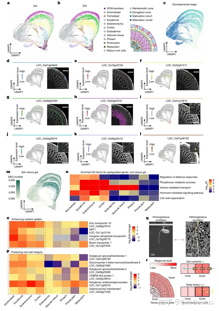 与在无菌均质凝胶中繁殖相比,在土壤中生长的根似乎通过上调所有细胞类型中的防御、营养和细胞壁相关基因表达来适应其异质性环境。与内部细胞层相比,外部细胞层更敏感,加强营养吸收(即“获得营养”)和细胞壁完整性,以促进根系探索土壤中的异质资源。这种细胞层特异性反应也有助于保护发育中的根系免受非生物和生物信号的影响(即“保持压力”),这些信号在自然土壤中分布不均匀。这些重要的见解突出了在自然土壤环境中生长的样品上应用单细胞分析方法的好处。