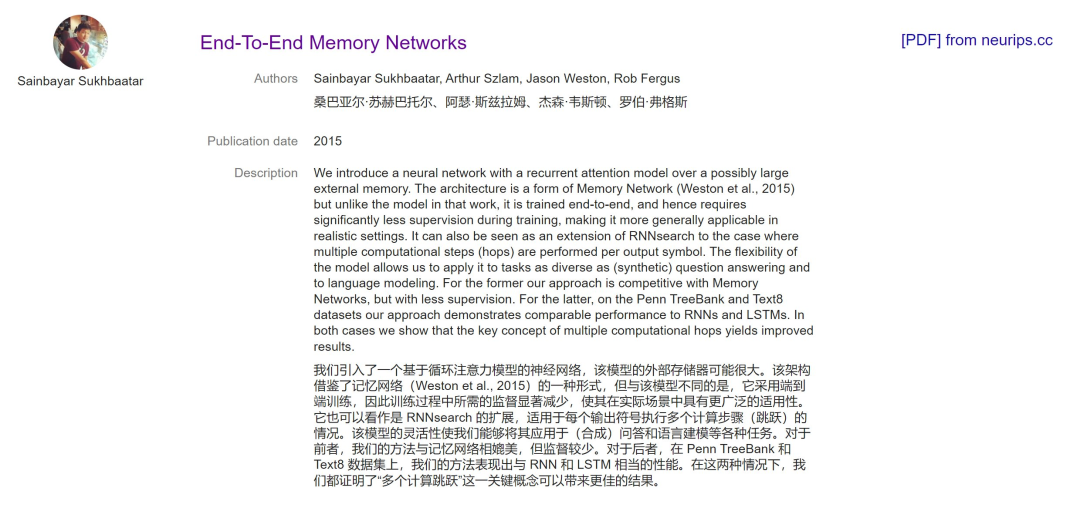 同时,也有一些论文的光芒被它掩盖,比如发布于 2015 年的「End-To-End Memory Networks」。