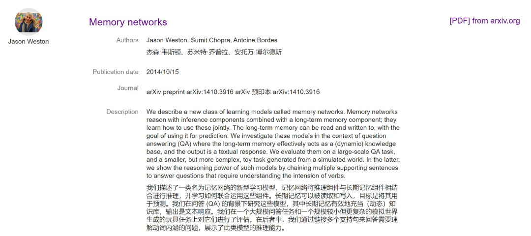 作者提到,这篇论文是对 Facebook AI 研究院 2014 年的一篇论文——「Memory Networks」的改进。「Memory Networks」引入了多层堆叠的硬注意力机制(hard attention)——与 Bahdanau 等人在单层上引入软注意力是同期提出的。