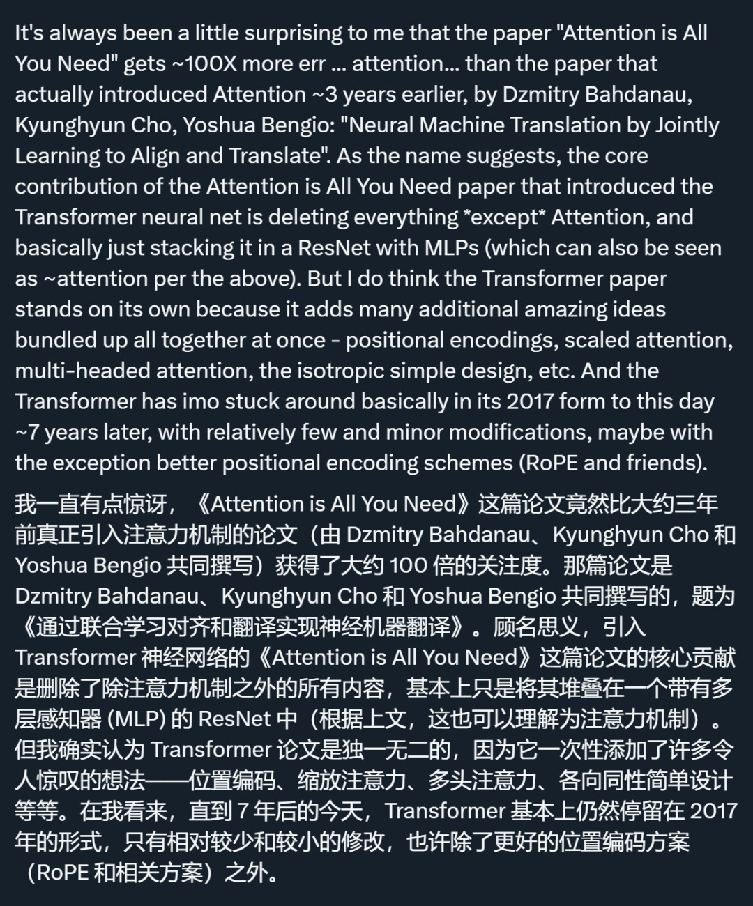 在去年的一个帖子中,AI 大牛 Andrej Karpathy 曾发帖感叹,Bahdanau 等人在单层上引入软注意力的那项工作——「Neural Machine Translation by Jointly Learning to Align and Translate」才是真正引入注意力机制的论文(最近拿到了 ICLR 2025 时间检验奖的亚军),但「Attention is all you need」所受到的关注却是它的 100 多倍。不过,他也承认,「Attention is all you need」这篇论文有其独特性。