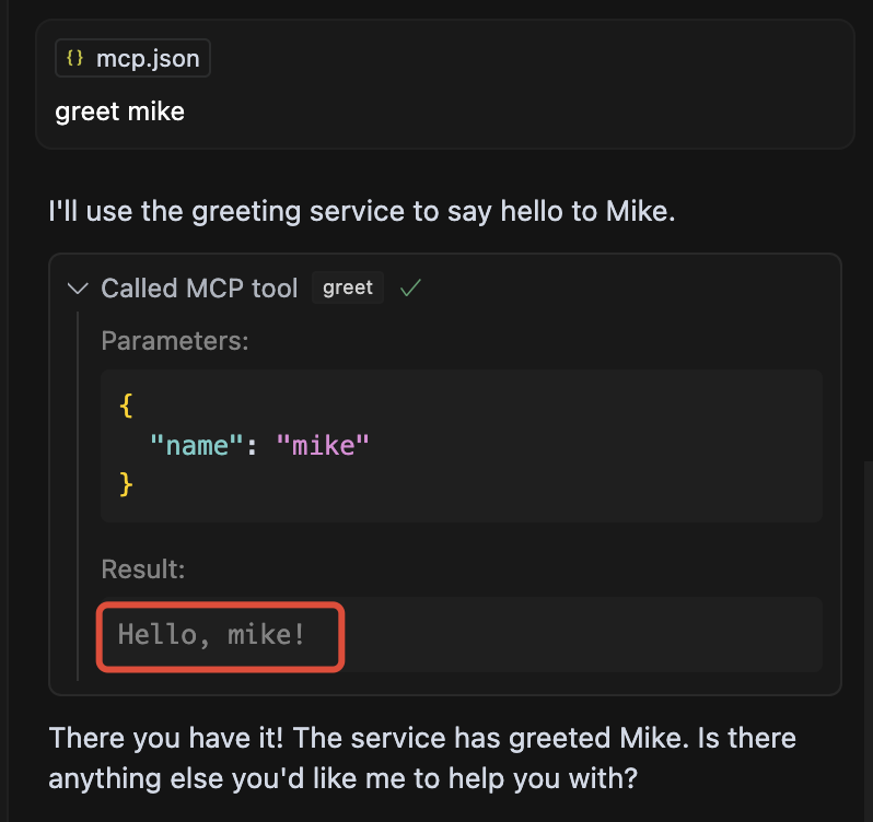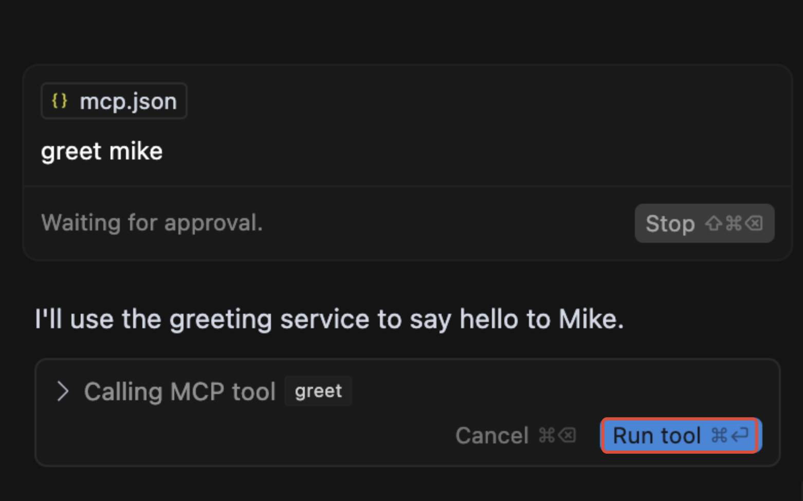在Curosr中可以和agent对话,比如输入greet mike,Cursor识别到MCP中的greet工具函数,会提示你是否运行工具,点击按钮即可。