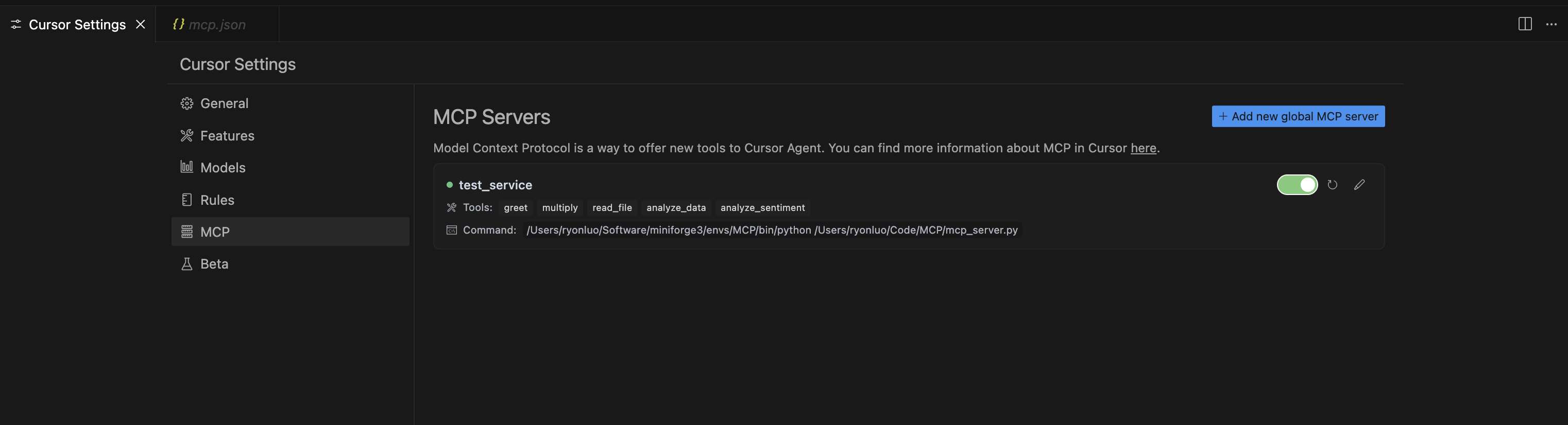 asyncio.run(main())File -> Preferences -> Cursor Settings -> MCPAdd new global MCP server,编辑 mcp.json:{