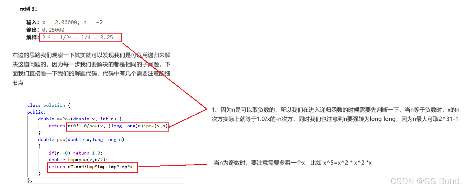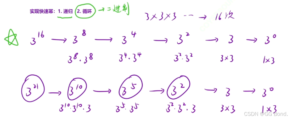 看上面的这个示例,我们要求一个数的n次幂,按照一般的循环方式在这道题是会超时的,所以我们采取的是有点类似把幂二分的方法,比如3的16次方实际上就是两个3的8次方相乘,具体流程如上图所示,这种方法叫做快速幂
