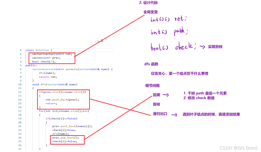 解释: 1.全局变量: 首先我们先看一下我们全局变量的定义,对于回溯类的题,我们一般都需要定义全局变量,方便我们解题,因为回溯类的题型往往是需要我们记住的路径的,从而让我们能够返回上一步,所以我们定义了一个path,还定义了一个返回值ret,最后往往还需要一个布尔类型的数组check,在路径不能重复的题上,比如本题,一个路径上同一个元素只能出现一个,所以我们就需要把有重复元素的路径剪掉(剪枝),借助check数组,我们就可以把使用过的元素进行标记,从而从另一方面实现剪枝的效果