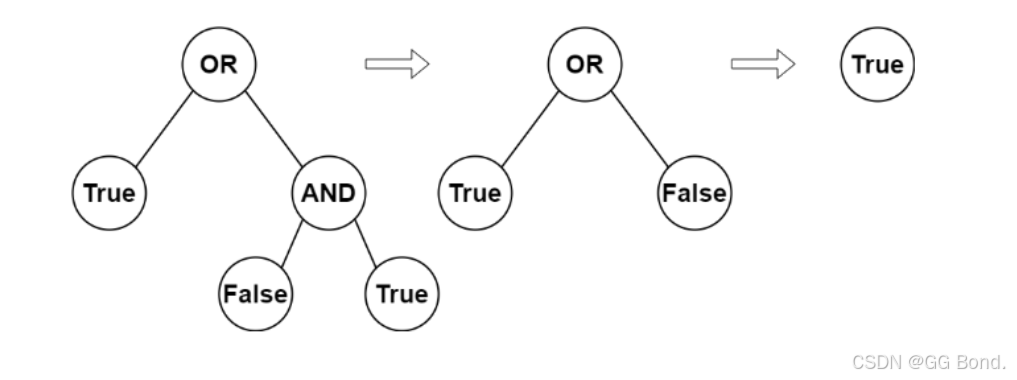 首先我们通过图就能看到叶子节点上的值是布尔值,非叶子节点上的是二进制运算符,我们要做的就是从下往上把叶子节点上的值进行计算,直到计算到根节点为值,每一个非叶子节点计算后,它所保存的值就变为计算结果,可以理解成计算之后它变为了新的叶子节点