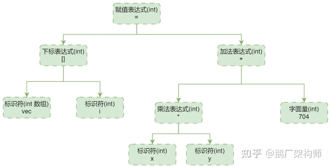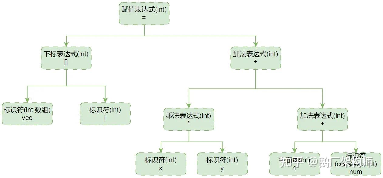 语义分析阶段针对代码中的静态语义进行分析,主要进行声明和定义的类型匹配性检查,类型转换的合法性检查等。如将int类型指针赋值给double类型指针时,编译器会提示类型非法。经过语义分析以后,整个表达式树都有了具体的类型对应,如下所示。