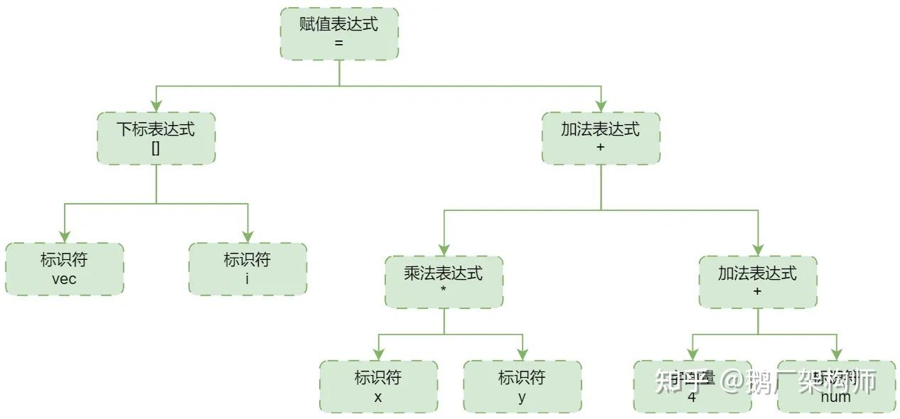 语法分析基于词法分析得到的记号,一般采用上下文无关语法进行分析,最终解析得到一棵语法表达式树,如下所示: