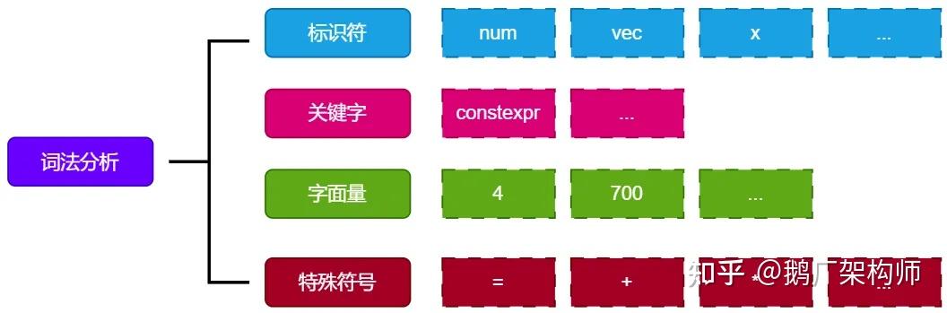 词法分析阶段会对预处理文件中的源代码文件进行逐字扫描,采用有限状态机等算法分析出源代码中字符属于 标识符 关键字 字面量 和特殊符号中的那一类。上述代码经过词法分析后结果示意如下:
