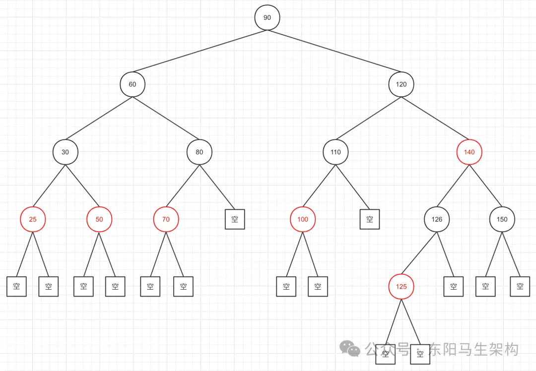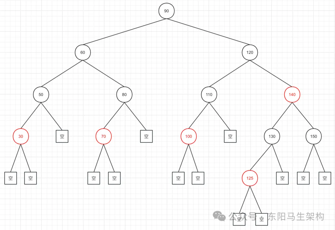至此,为新插入结点125所做的旋转和重新着色的操作就完成了,现在该树已经成为标准的红黑树了。
