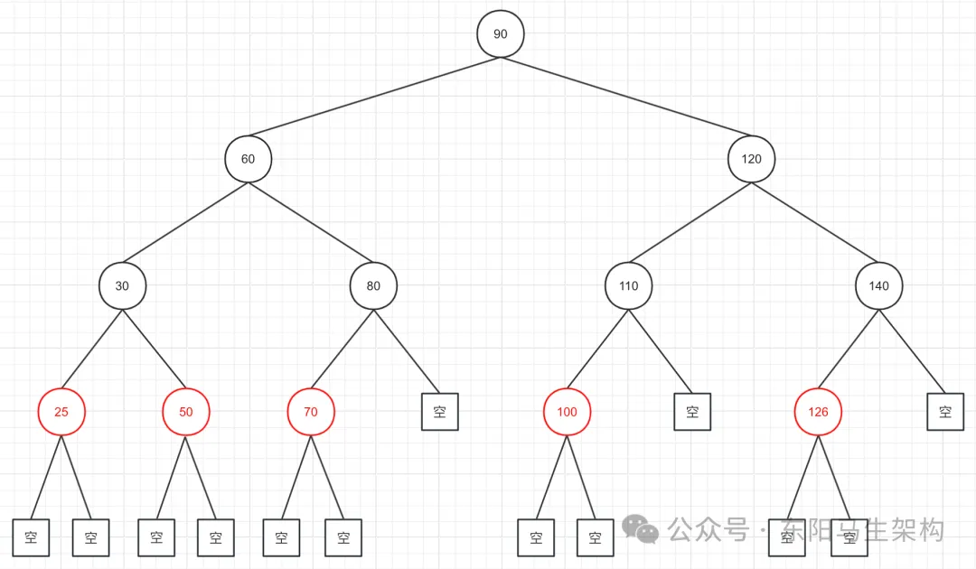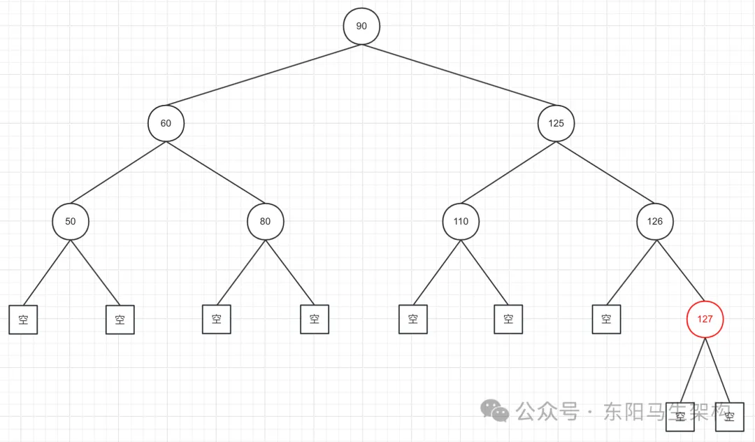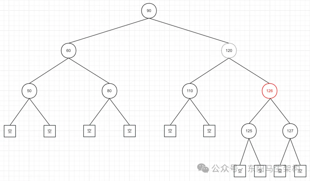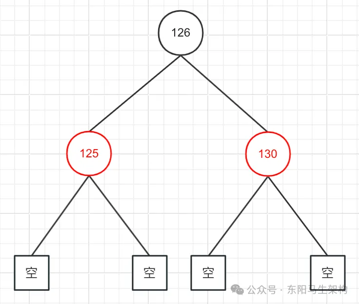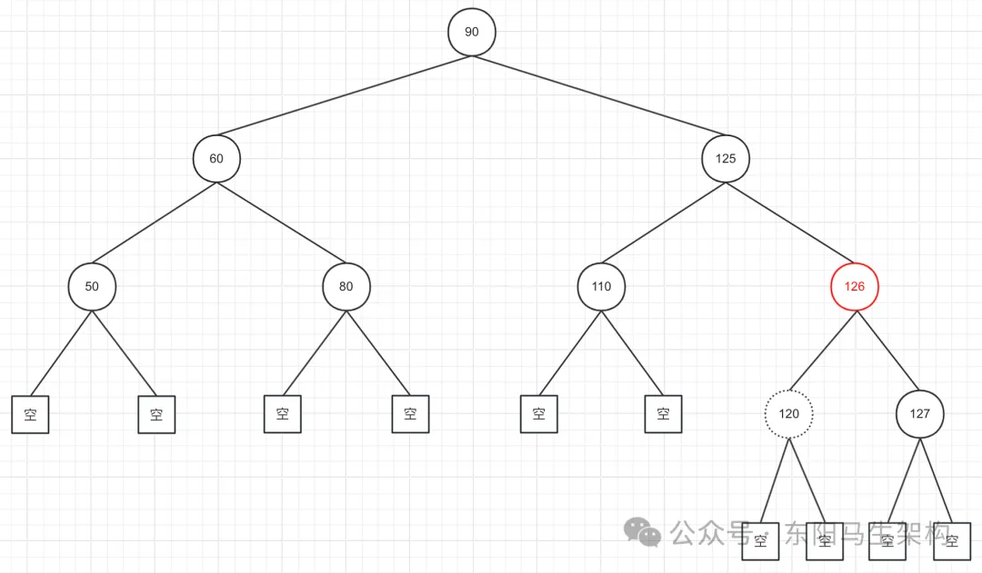 上述两种情况都是同一个处理办法。比如新插入结点126,其父结点125为红色,其叔结点为空的黑色叶结点。而且新插入结点是父结点的右孩子,父结点是爷结点的左孩子。