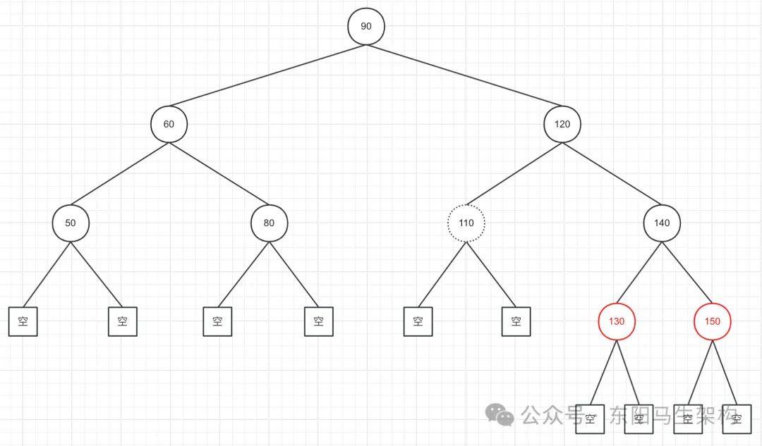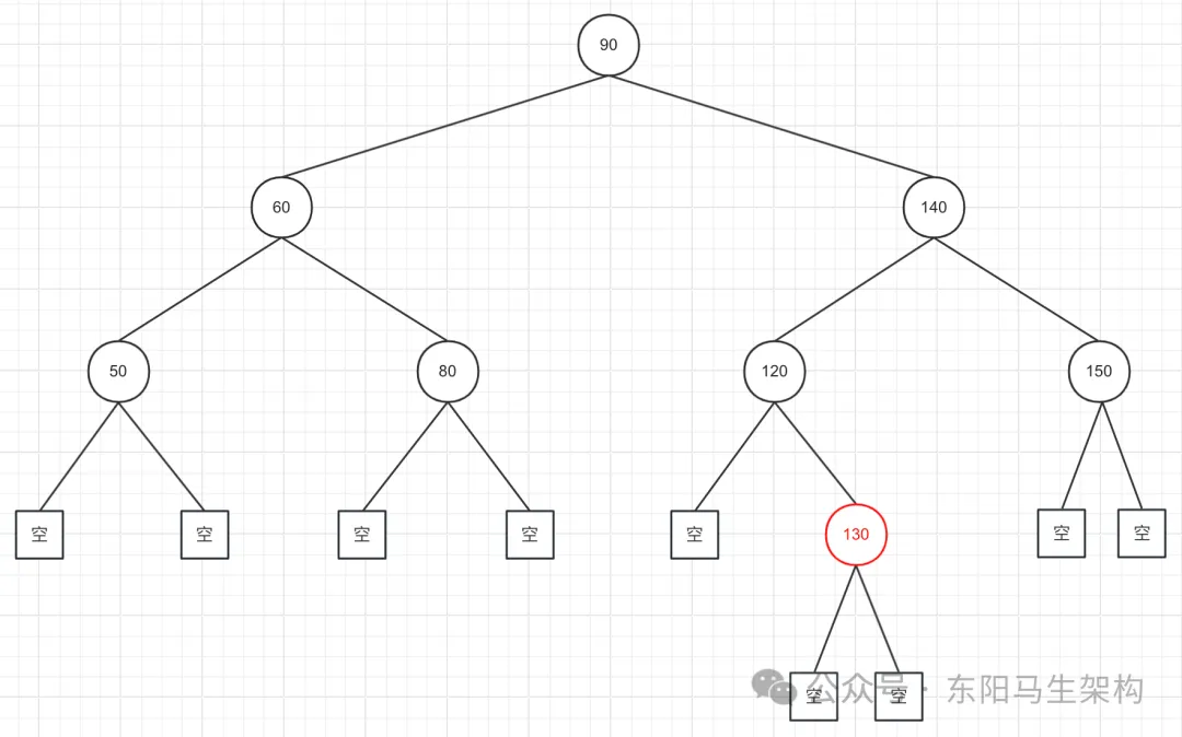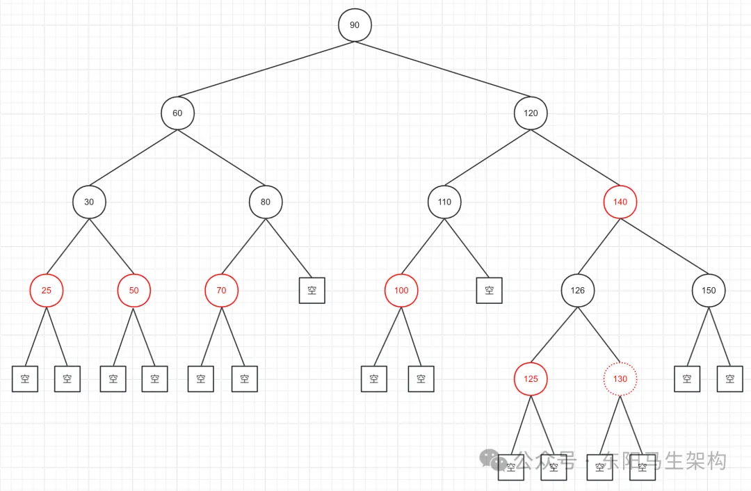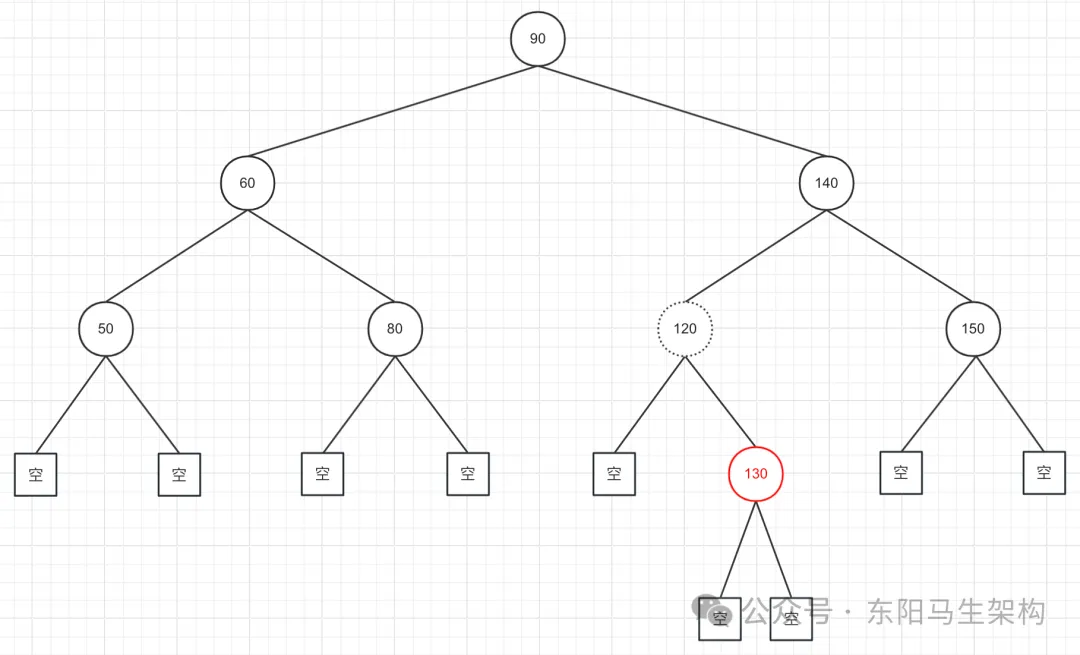 因为删除的是红色结点,不会影响红黑树的性质五,所以可直接删除。如下图示,假设现在要删除的结点是130: