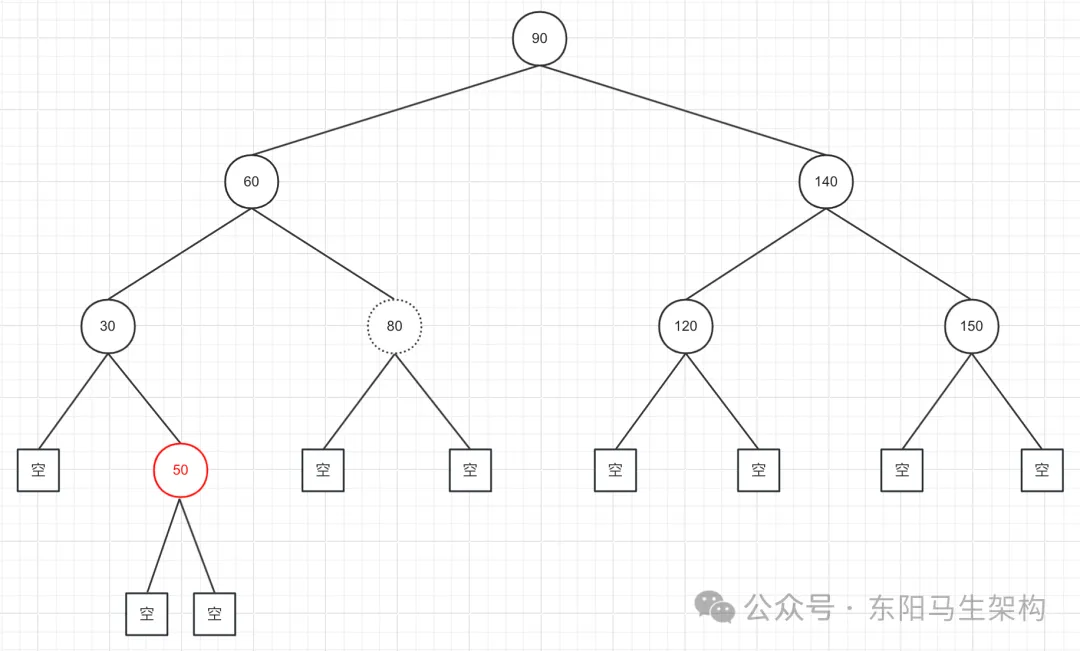 如下图示,假设现在要删除结点80。其兄弟结点只有一个孩子,兄弟结点为左孩子,兄弟结点的孩子为右孩子。