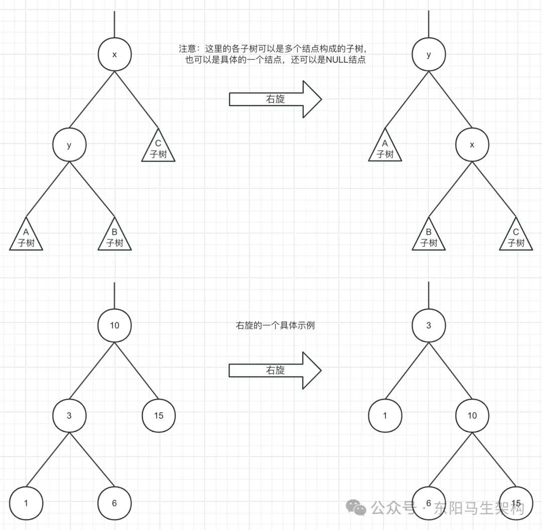 右旋是将x的左子树绕x顺时针旋转,使得x的左子树成为x的父亲,同时注意修改相关结点的引用。旋转之后,要求二叉查找树的属性依然满足。