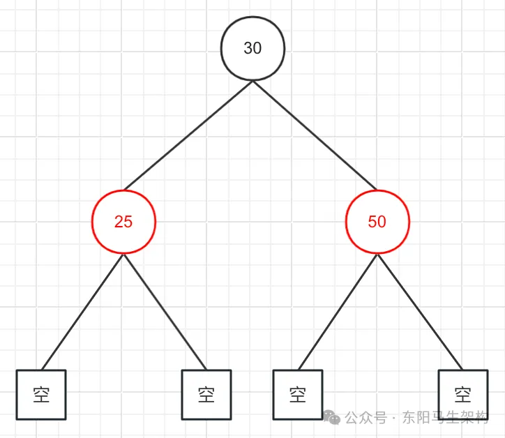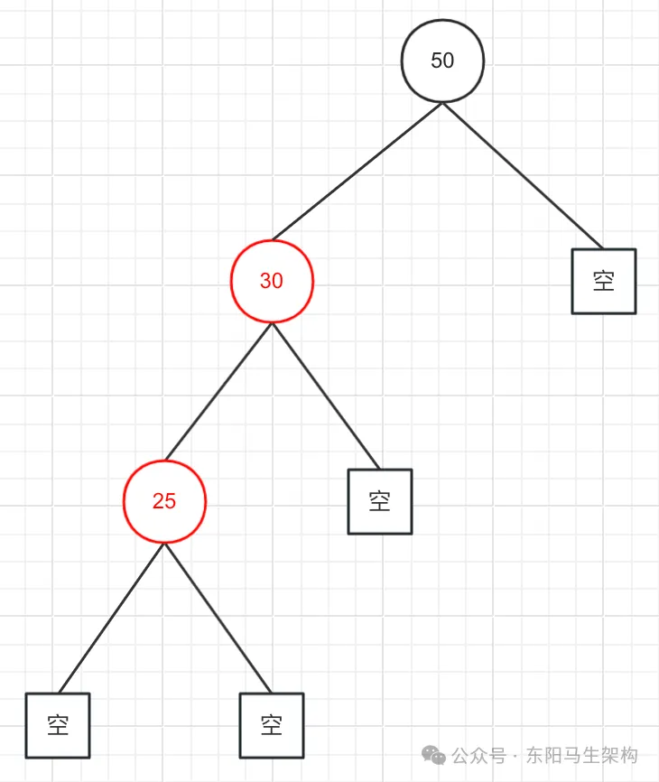 上述两种情况都是同一个处理办法。比如新插入结点为25,其父结点30为红色,其叔结点为空的黑色叶结点,而且新插入结点和其父结点都是左孩子(右孩子),如下图示: