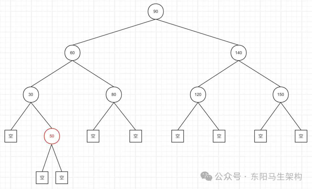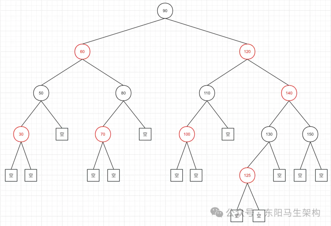 然后又将140结点当作新插入结点处理。因为140结点和新插入结点面临的情况都是一样的:和父结点都是红色。于是将140结点的父结点120和叔结点60变成黑色,爷结点90变成红色。因为爷结点90是根结点,要满足根结点是黑色的性质。所以又将140的爷结点90,也就是根结点变成黑色,如下图示: