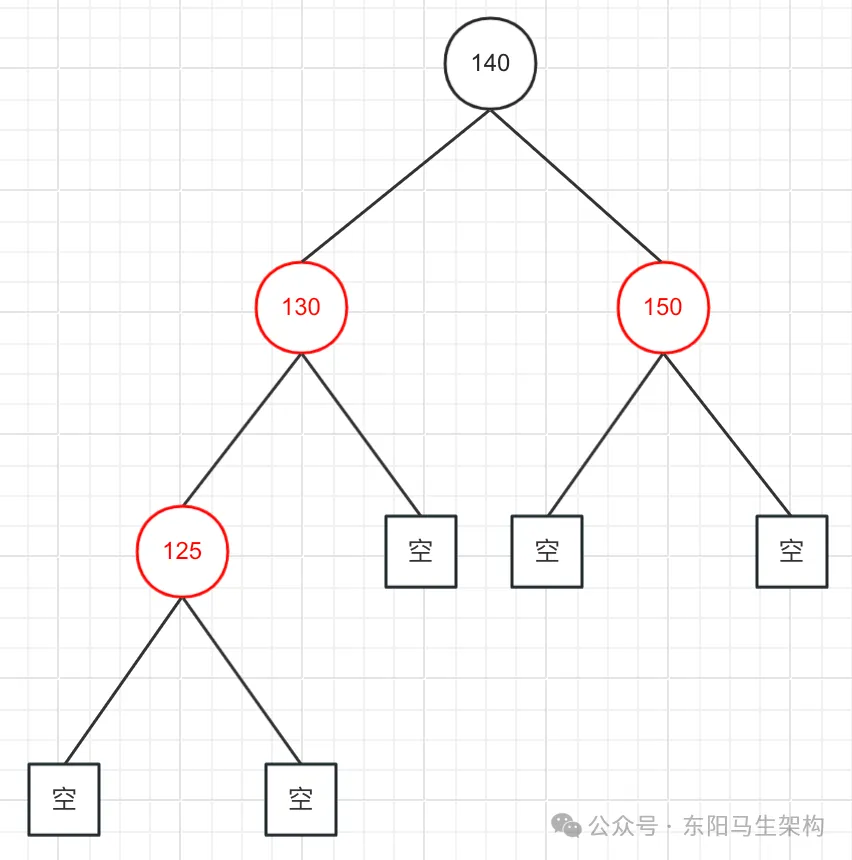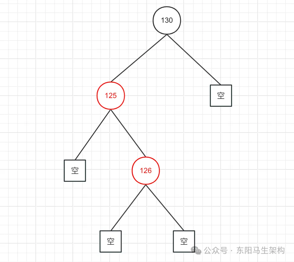 于是125结点和130结点都是红色的,这显然违背了规则4: