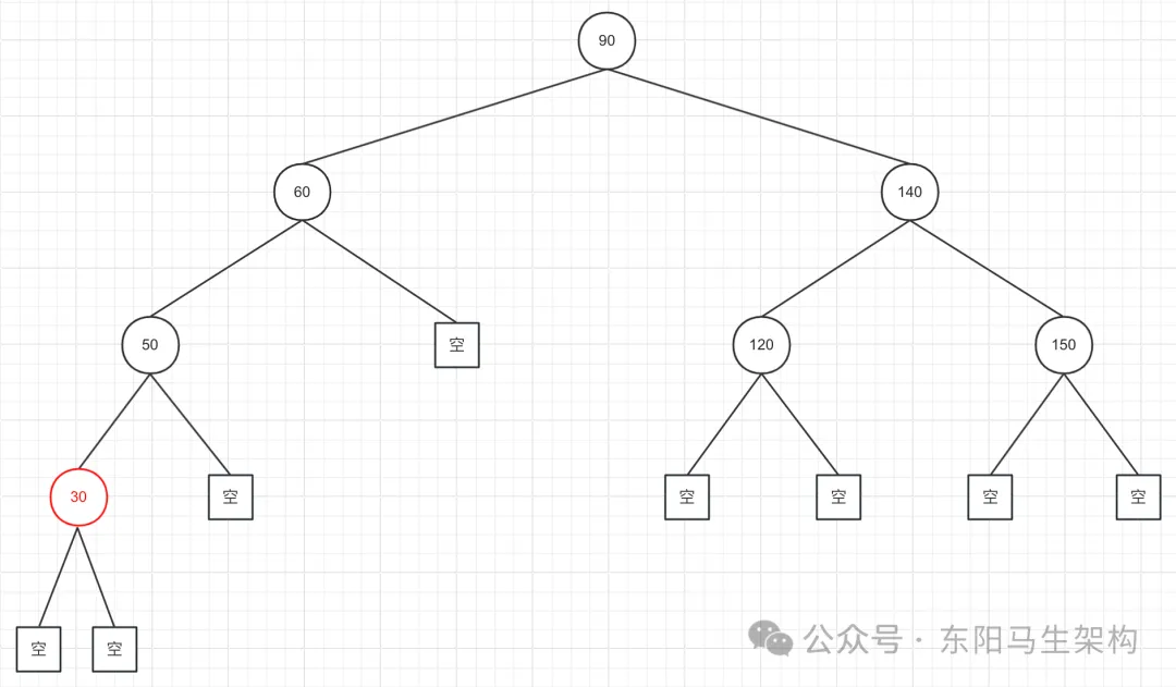 注意:现在还没有结束变换,我们发现变换后的红黑树和情况三很相似。兄弟结点50和兄弟结点50的子结点30处在同一边,于是按照情况三处理:如果兄弟结点和兄弟结点的孩子都是右子树,则对父结点进行左旋;如果兄弟结点和兄弟结点的孩子都是左子树,则对父结点进行右旋。然后把兄弟结点的孩子结点30着为黑色,以满足红黑树的性质五。上图的情况是都是左子树,所以对父结点60进行右旋,结果如下所示: