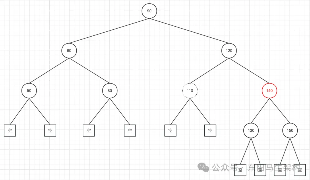 如下图示,假设现在要删除结点110,其兄弟结点140只有一个孩子结点150,而且都是右子树。