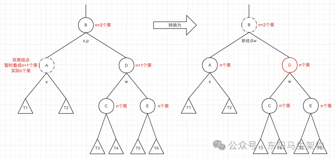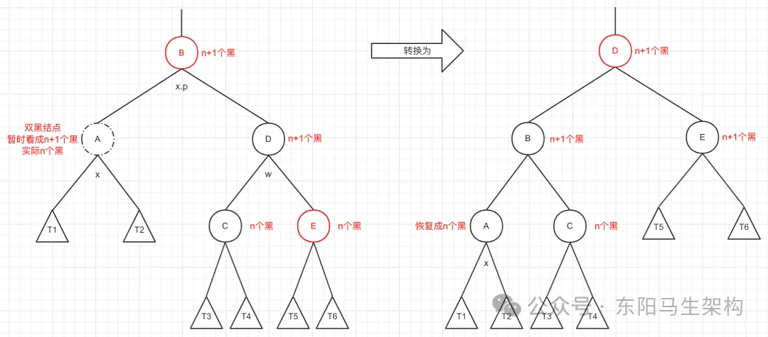 为了补偿从x和w中去掉的一重黑色,可以把x的父结点x.p额外着一层黑色,从而保持局部的黑高不变。