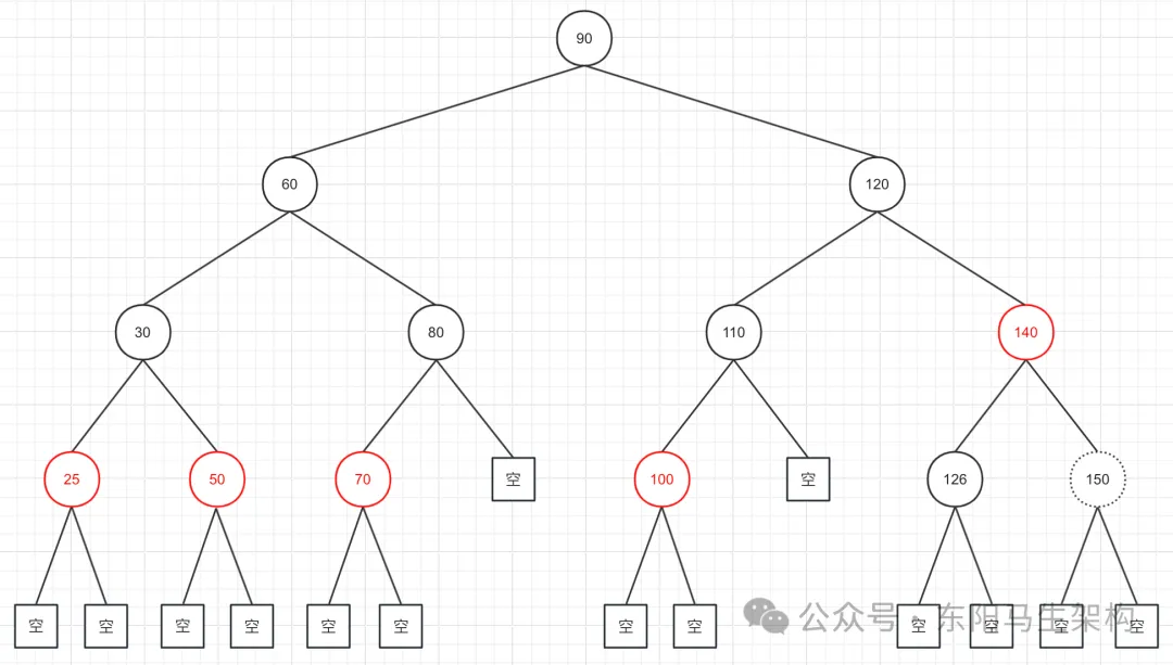 可以先删除结点150,然后将兄弟结点126变成红色,父亲结点140变成黑色,这样做的目的是为了满足红黑树的性质五。否则根到最右边的叶子结点经过的黑色结点只有3个,而其他路径的黑色结点有4个,结果如下所示: