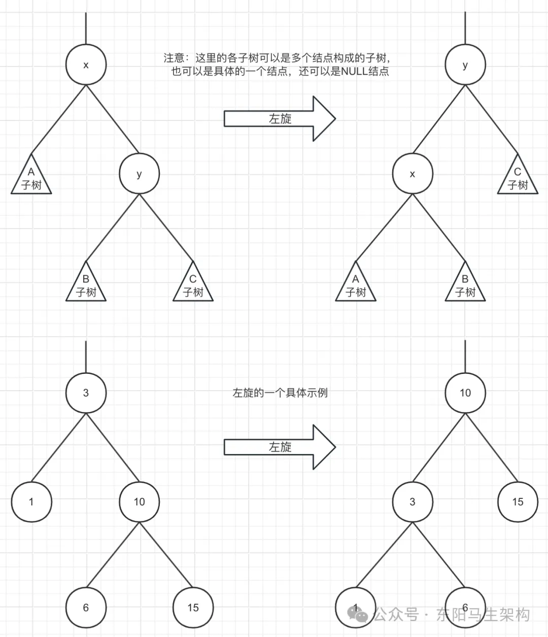 左旋是将x的右子树绕x逆时针旋转,使得x的右子树成为x的父亲,同时修改相关结点的引用。旋转之后,要求二叉查找树的属性依然满足。