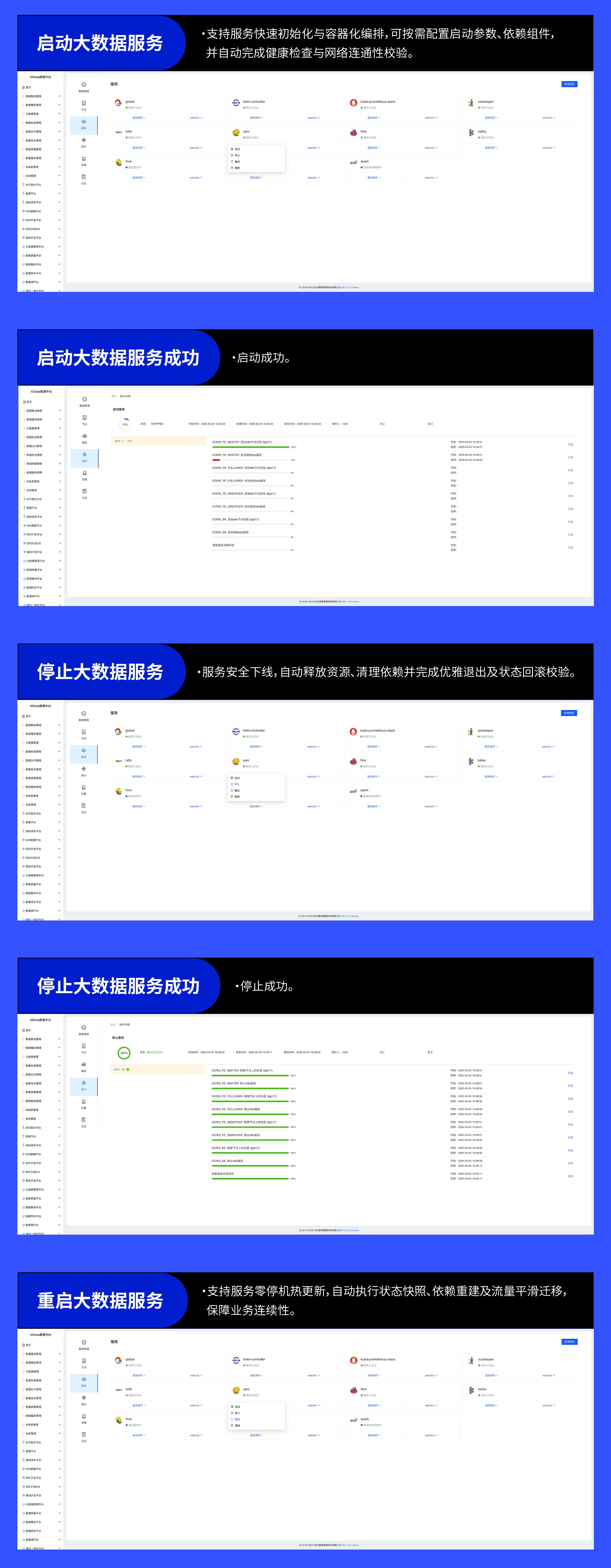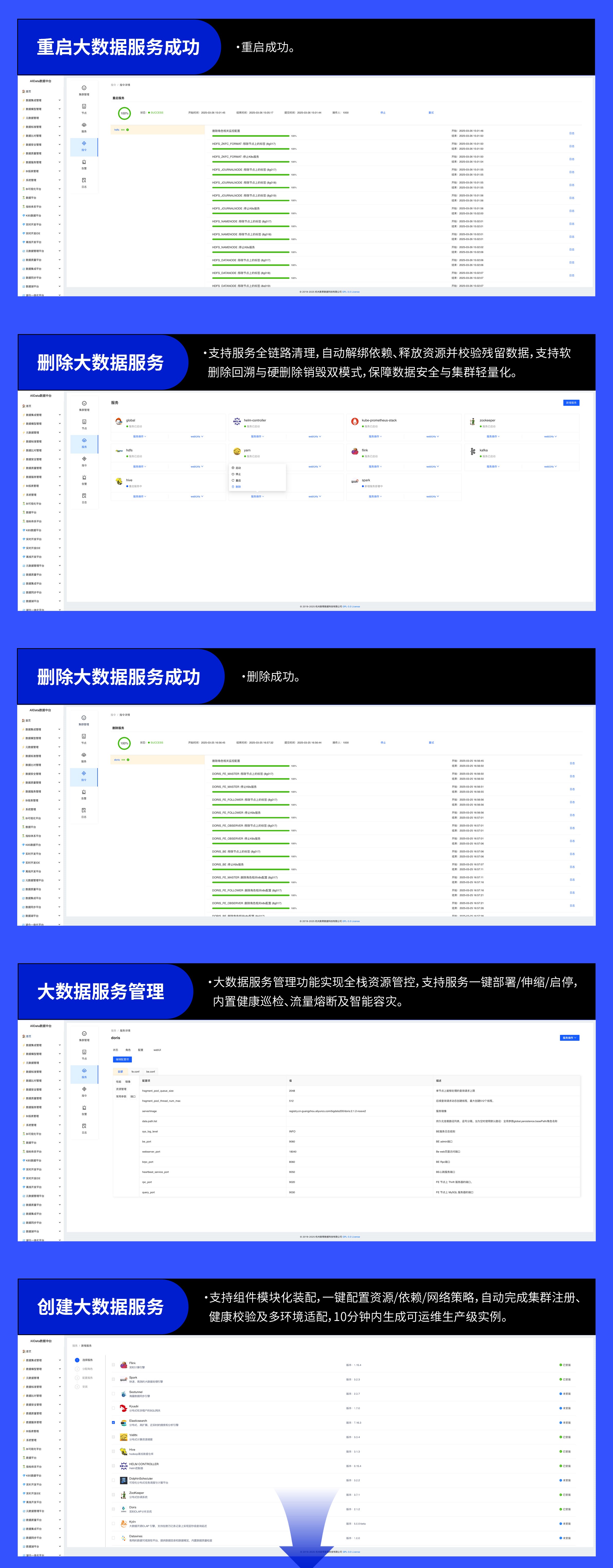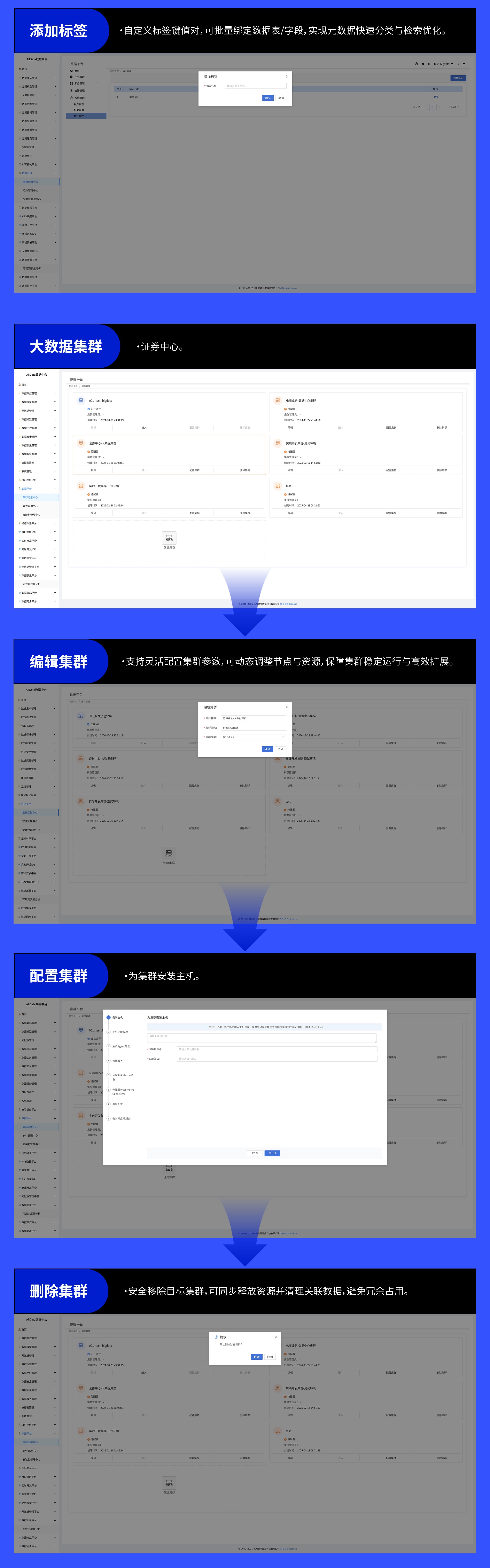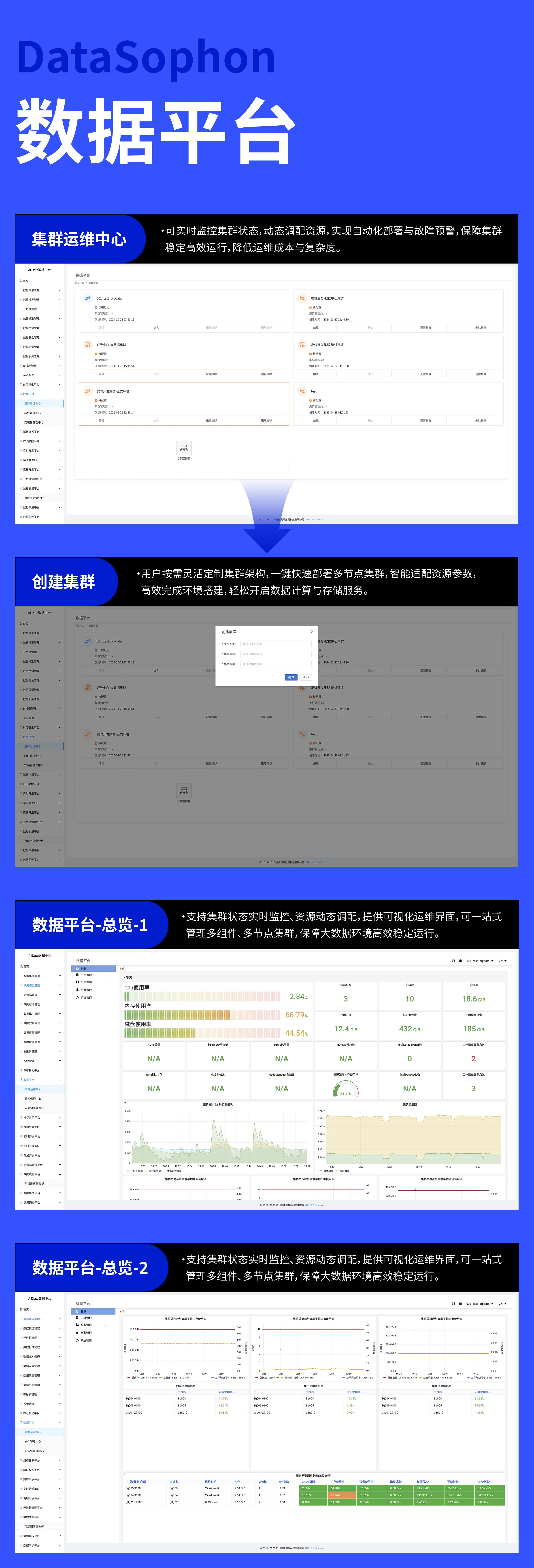 定位:数据平台(DataSophon)为云原生大数据管理利器,支持快速部署、高效管理、实时监控与自动化运维,助力企业构建稳定、高效的大数据集群,实现资源弹性伸缩。