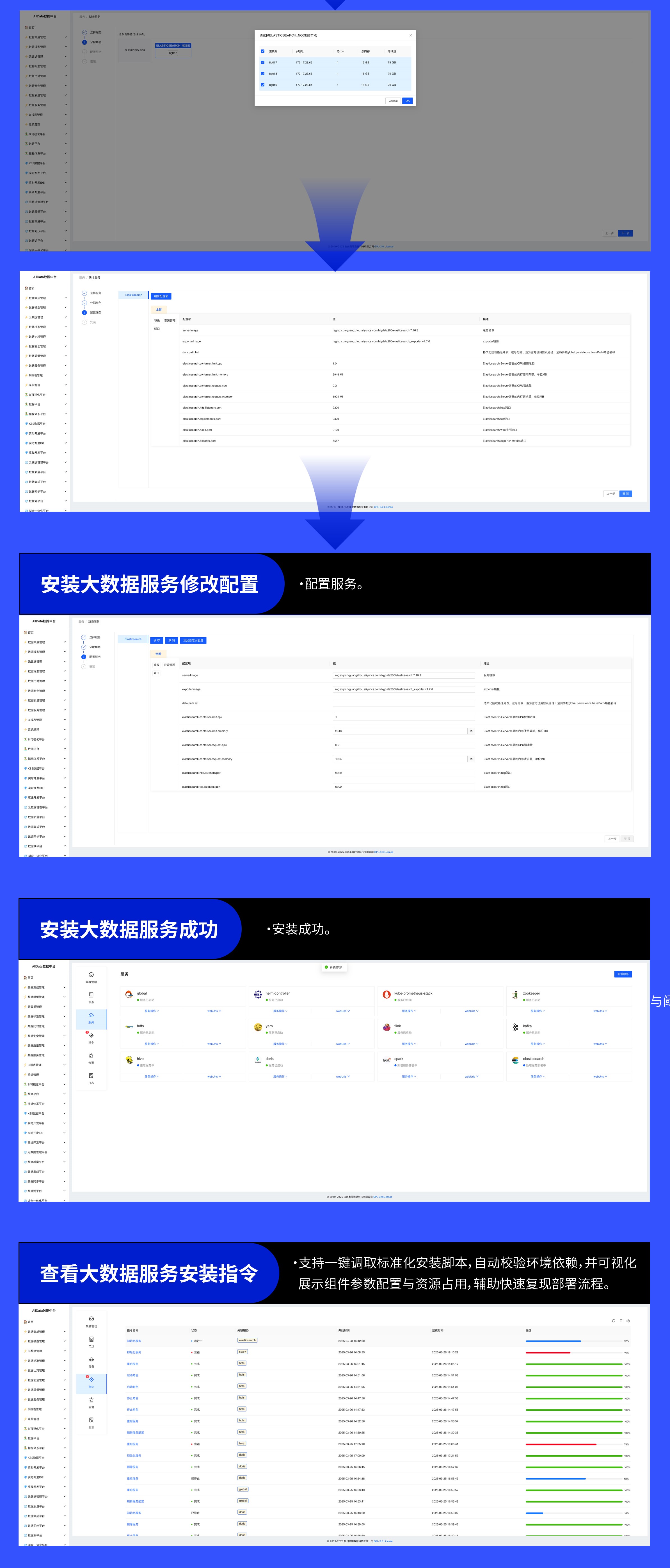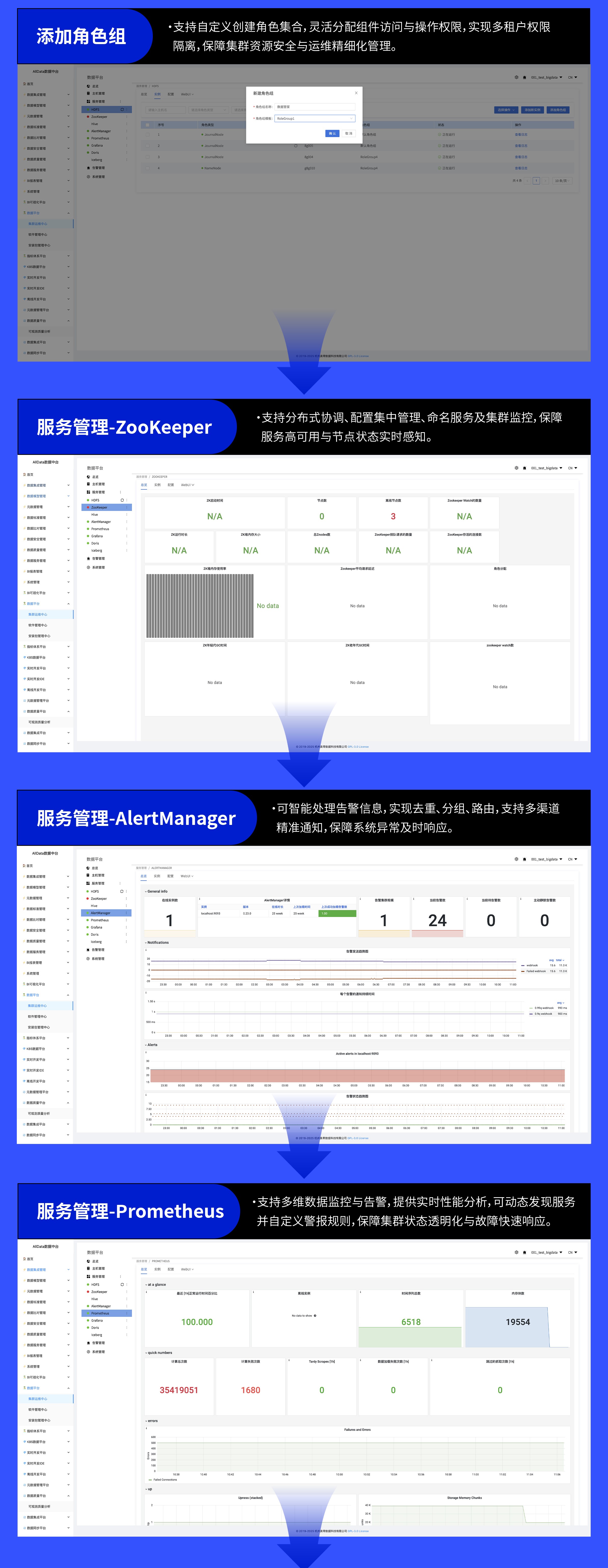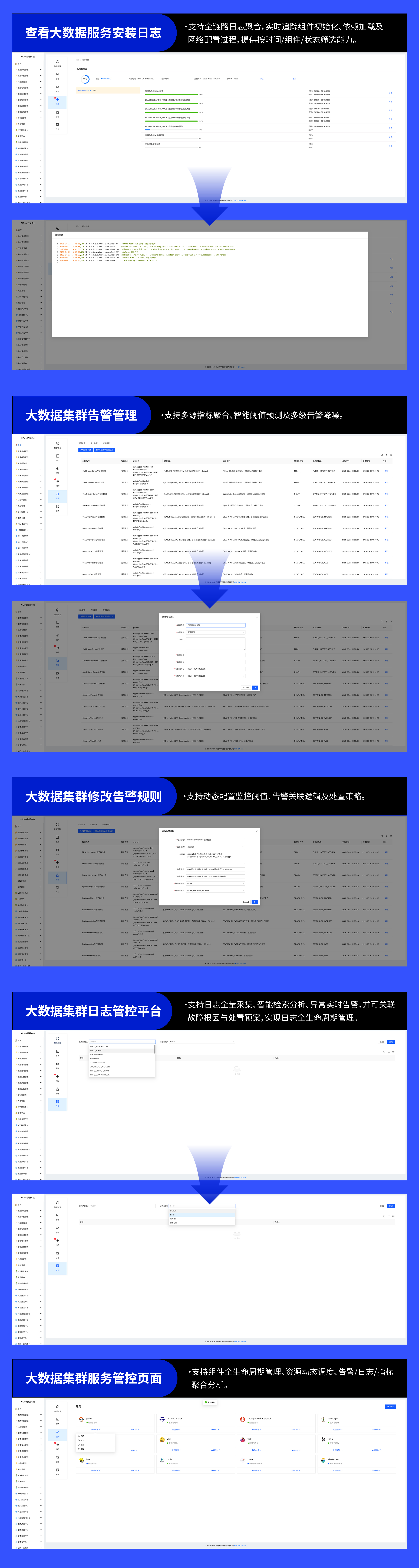 功能特性:可快速搭建大数据集群容器化运行大数据服务支持监控告警等功能支持配置修改等功能自动化运维可视化管理界面。