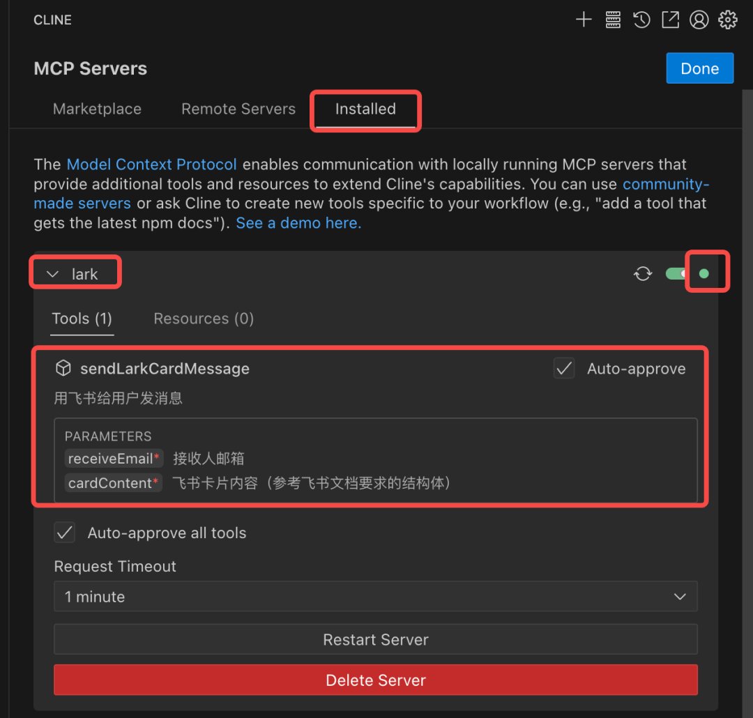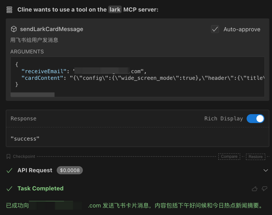 可以看到 Cline 调用了大模型开始思考,并且根据 MCP Server 提供的 Tools 开始选择发送消息接口并执行。