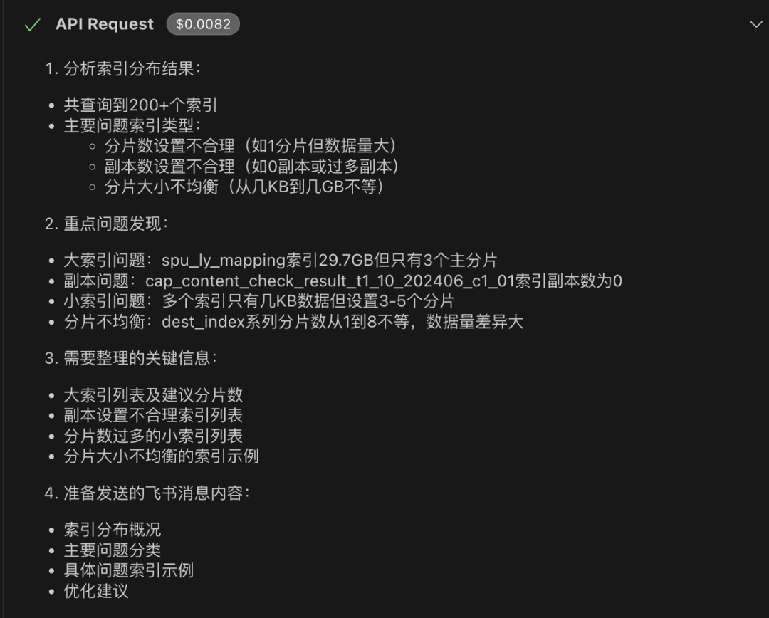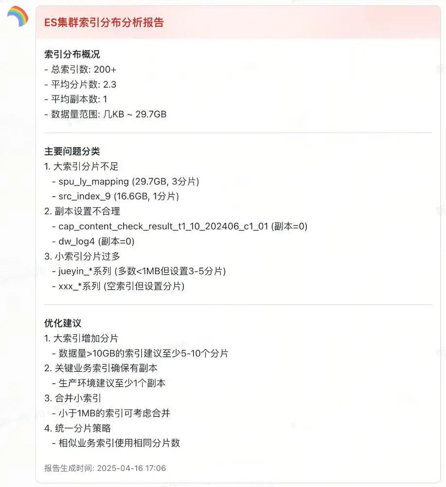}配置好后,在对话中发送:分析一下 es 集群目前的索引分布,重点分析一下哪些索引的分片设置不合理,最终整理后飞书发给我。