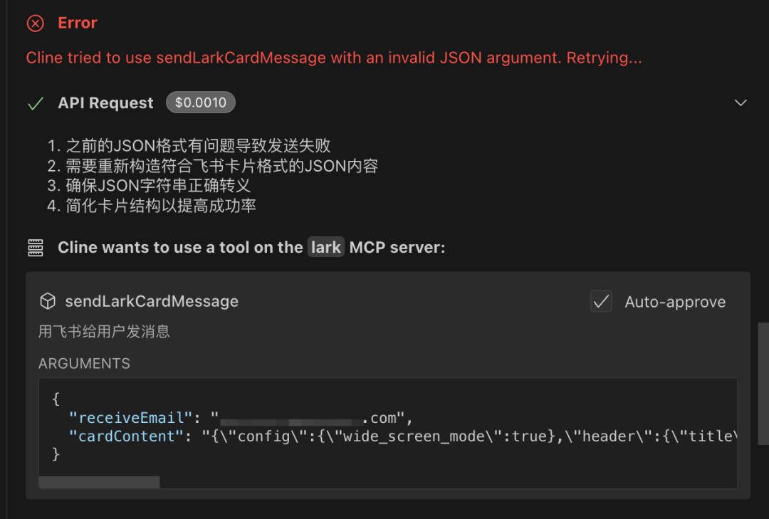 而且如果第一次尝试失败,还会自动纠错,最后成功调用了我们 MCP Server 提供的 Tools,发送了一条消息给我。
