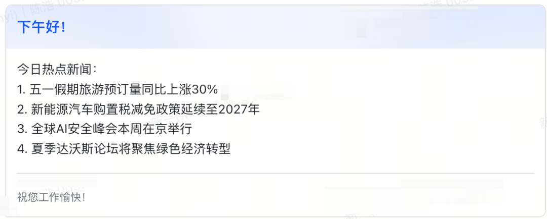 点击右上角的+号开始聊天:给我发一条下午好的飞书卡片消息,附带一下今日的热点新闻。