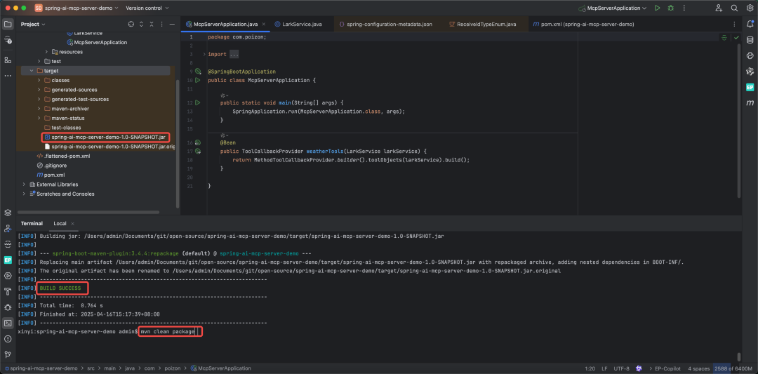 到这里一个简单的 MCP Server 就已经开发完成了,下面只需要执行 mvn clean package 打成可执行 jar 包就能配置到 Cline 中了。