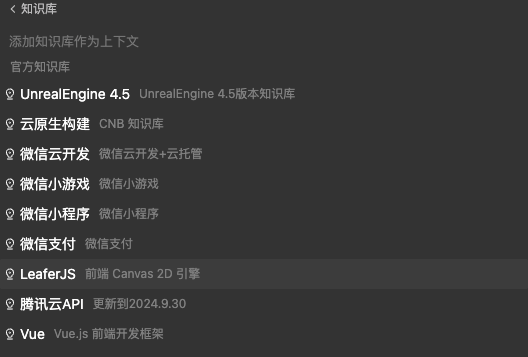 同时有一点做的比较好的是在 DOCS选项中会内置一些三方的知识库,尤其是在开发微信小程序,小游戏一些需要严格遵守文档要求开发的项目中,这种内置的三方知识库会大大减少开发者的时间提高开发效率