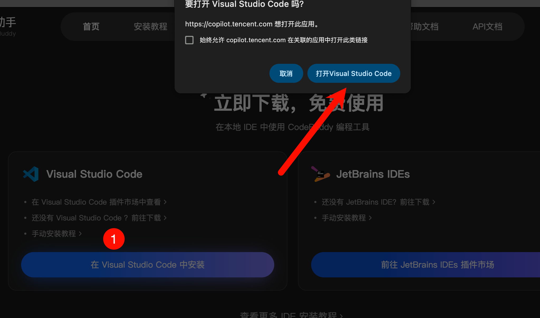 点击官网下载地址: https://copilot.tencent.com/后,点击免费使用