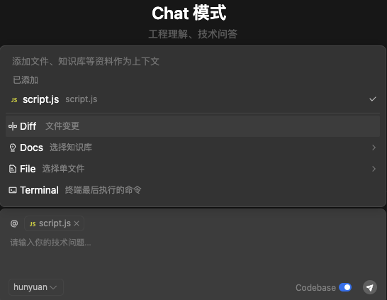 Chat模式中可以选择一些自定义指令包括将一写单文件/知识库/终端指令和diff加入对话上下文,方便用户快捷操作