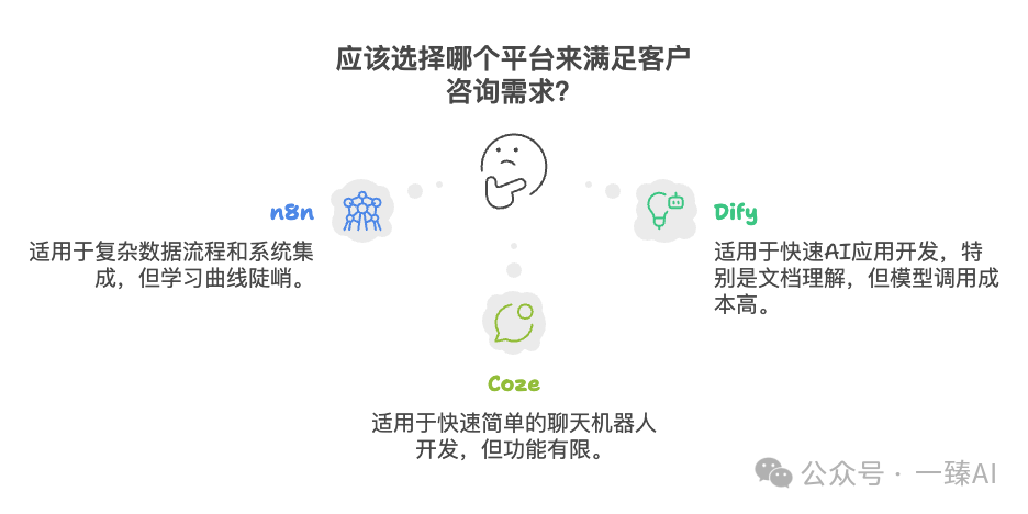 "如果你只想做个简单的聊天机器人,又不想花太多时间学习,那就选Coze。五分钟就能做出个机器人放在微信里用,爽得很!不过它功能相对简单,复杂业务处理不了。"