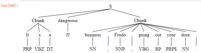 chunked_text.pretty_print() # 显示分块后的短语结构,以标准格式输出词性标注结果: [('It', 'PRP'), ("'s", 'VBZ'), ('a', 'DT'), ('dangerous', 'JJ'), ('business', 'NN'), (',', ','), ('Frodo', 'NNP'), (',', ','), ('going', 'VBG'), ('out', 'RP'), ('your', 'PRP$'), ('door', 'NN'), ('.', '.')] 通过树形的形式进行可视化输出: