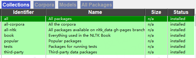 nltk.download() 在Windows系统中会进入一个安装界面,点击install,等待全部包的安装完成。