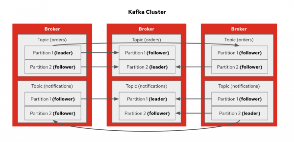 同一类消息的集合,topic通常在1个或者多个的broker跨区复制实现容错,每个topic上有不同的分区。
