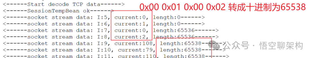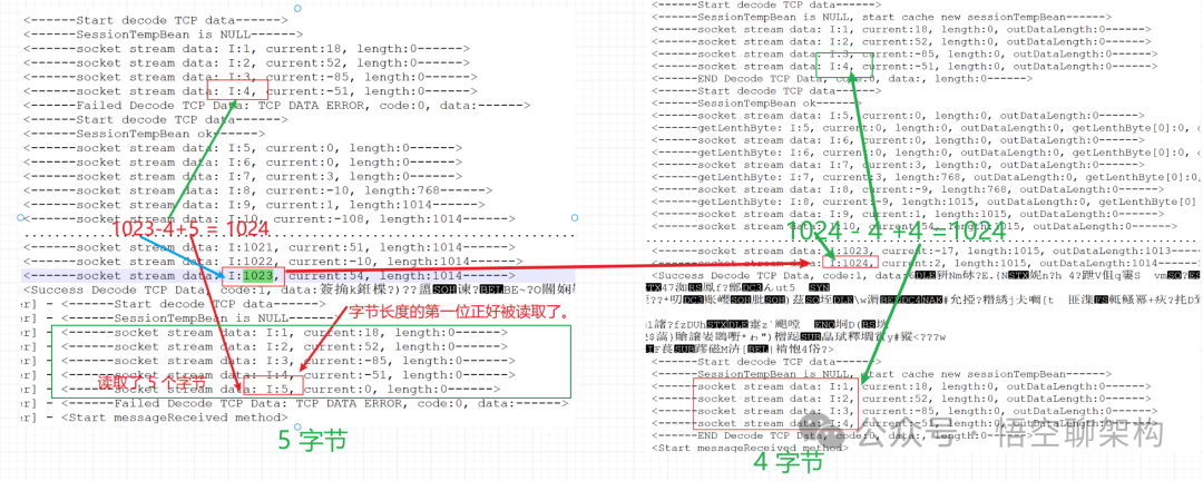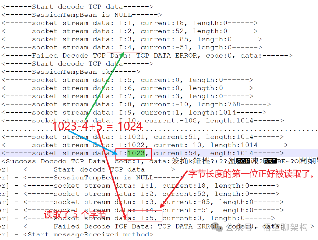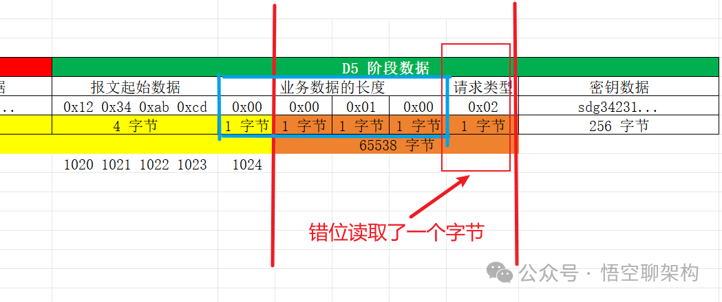 因读取的数据报文达到1024 字节时,将业务数据的长度这四个字节做了切割,前面1024字节包含长度字段的第一个字节,长度字段的后面3个字节和请求类型的 1个字节组成了长度字段的 4 个字节,也就是错位多读取了后面一个字节的内容,最后算出来长度的值为 65538,不等于后面的业务数据的 256 字节,导致服务端的程序报错,所以后续代码就没有执行了。