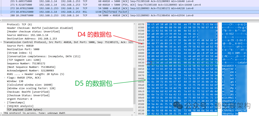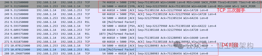 通过上图的抓包结果可以看到最后一个阶段是 D4 和 D5,它俩其实是将数据包合并在一起发送的(这个是我后来才发现的,也是 1024 卡 Bug 产生的源头)