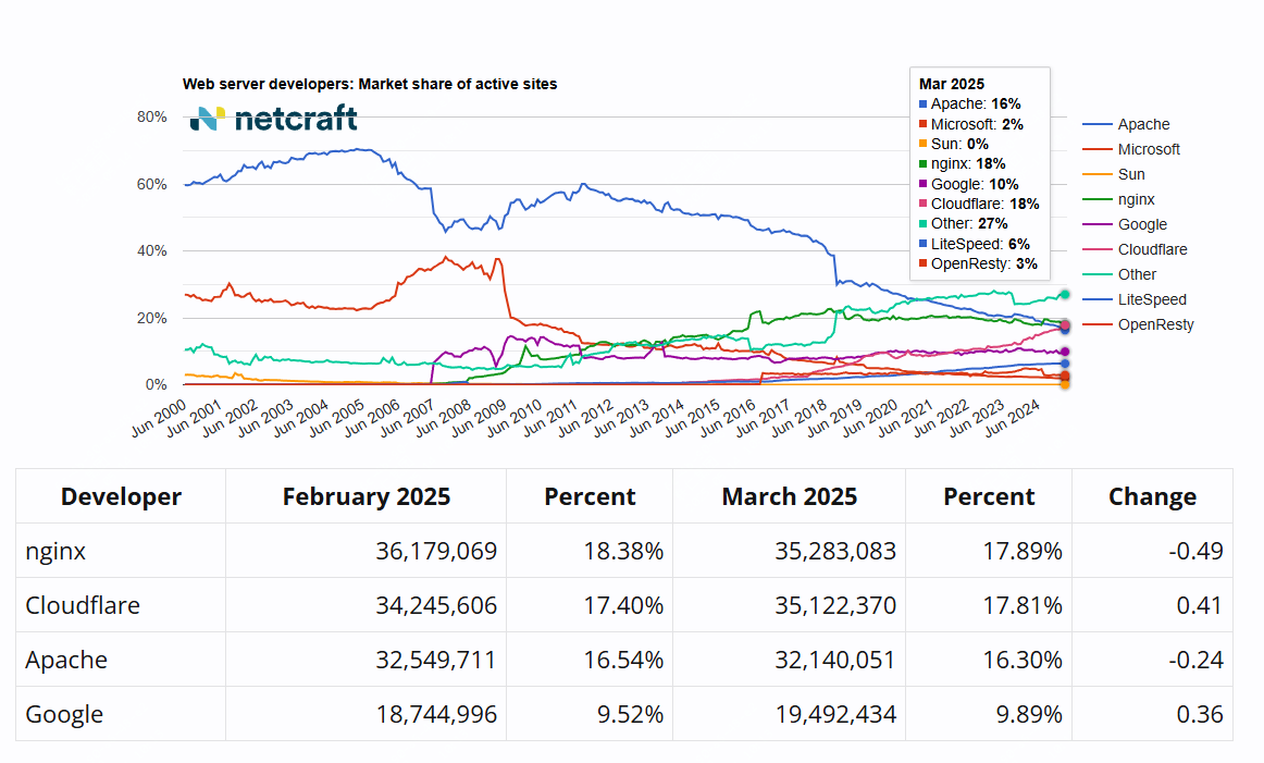 在2025年3月最新的web使用数据中,nginx占比18%,依旧排名第一,那么nginx为何会成为web服务的首选,它有哪些特性?